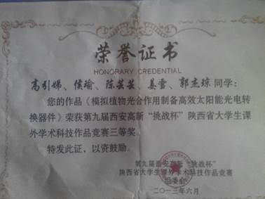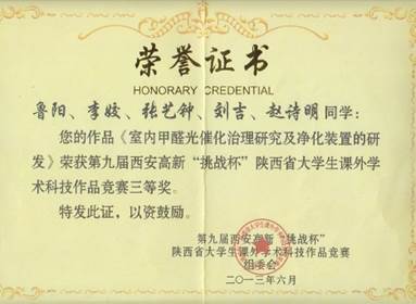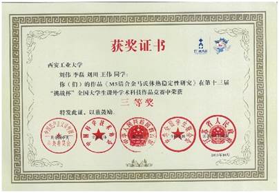 第九届 “挑战杯” 陕西省大学生课外学术科技作品竞赛三等奖 第十三届“挑战杯”全国大学生课外学术科技作品竞赛三等奖