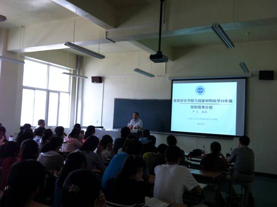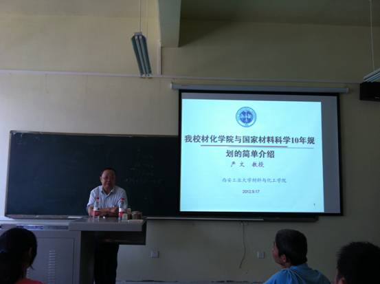 严文教授以“我校材化学院和国家材料科学10年规划”为题,为同学们简要地介绍了我院的历史与现状和材料科学与工程的相关知识。内容包括:西安工业大学的发展史;西安工业大学硕士研究生等学位授予问题;21世纪材料科学与工程前景以及材料在人类发展史中的作用等。期间,严老师睿智风趣的语言赢得了同学们的阵阵掌声。