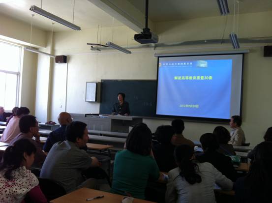 9月28日下午,材化学院在3A-312教室召开全体教职工大会,集中学习了教育部制定的《关于全面提高高等教育质量若干意见》的30条具体措施。本次集中学习由学院党委书记张忠老师主持。
