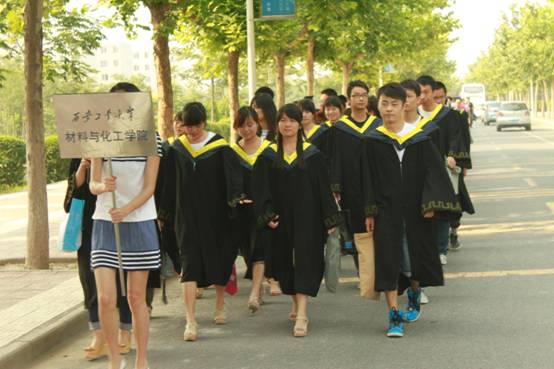又是一年绚烂的夏季,站在大四毕业的边缘,回首四年校园青春,无限感慨和依恋。今天的校园行活动在这样的时刻举行,更添了心中对母校的点滴感恩之情。早上八点,2013届毕业生穿着整齐的学士服在七公寓楼下集合,迎着初升的朝阳,沿着未央校区西环道缓缓前行,感受母校带来的亲切和温暖。同学们一边专注的讨论着学校的各种建筑,一边开心地和四年的同学合影留念。这一路,见证了我们从懵懂的少年成长为能够独当一面的佼佼者。我们感恩母校,也同样承诺将以最优秀的状态面对未来的挑战。此次的校园行活动不仅彰显了材化学院毕业生的风采,也让同学们更加深刻的认识到了母校的伟大。