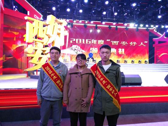 2017年3月14日下午,由西安市委宣传部、市文明办主办的2016年“西安好人”颁奖典礼在西安广电中心石榴花剧场隆重举行。材料与化工学院辅导员张瑞红、2014级学生郝亮亮、建筑工程学院2013级学生刘力泽参加了此次颁奖典礼,两名学生因在“见义勇为”方面突出表现荣获“西安好人”荣誉称号受到隆重表彰,颁奖典礼上,主办方通过视频展播、诗歌朗诵等形式深情再现了好人们的凡人善举。