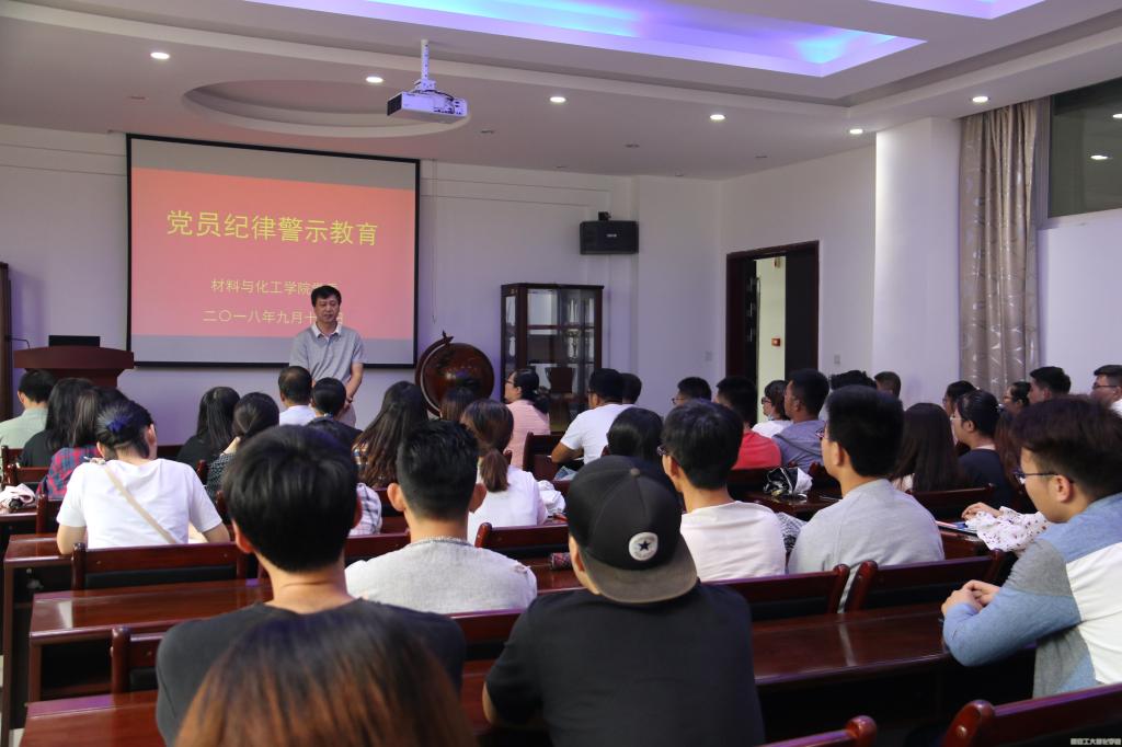 党有党纪,国有国法。国无法不安,党无纪不治。为提高党员纪律性,在生活、学习、工作中保持高度的思想觉悟,拒绝不良风气的侵蚀。2018年9月13日材料与化工学院党员代表在工3-404开展警示教育活动,学院党委书记路金龙、院长坚增运、副书记张艳霞参加会议。