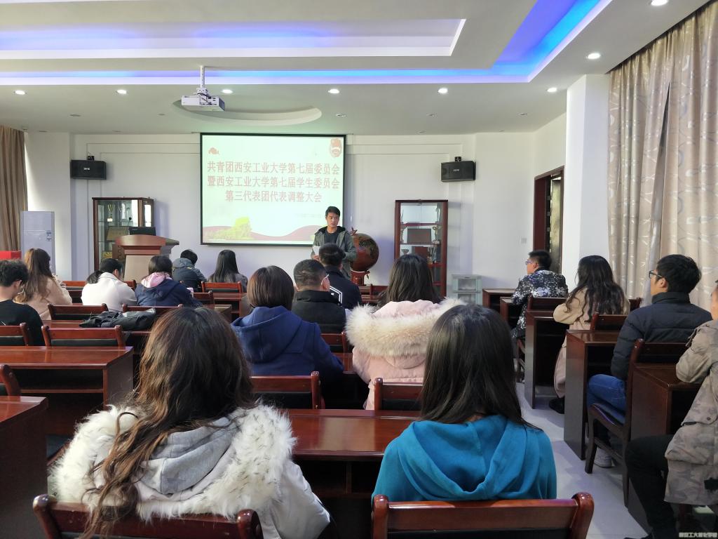 为调整双代会第三代表团代表,第三代表团于2018年11月26日在工三-404成功举办双代会第三代表团代表调整大会。参加此次会议的有西安工业大学团委实践部部长常玢超老师,材料与化工学院团委书记段强老师,外国语学院团委书记杨钰琳老师以及所有学生代表。