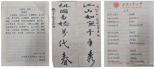 本次系列活动以“墨绘祖国”拉开帷幕,材化学子充分发挥自己的写作、绘画和书法特长,以个人感悟、家国情怀为视角,将自己的所见所闻和所感所悟充分表达了出来,以家乡变迁、时代更迭为切入点礼赞祖国。第二项活动是“诗颂祖国”,材化学院师生党支部联合开展“诗颂祖国”活动,用饱满的爱国情怀朗诵不同的诗歌,对祖国的赞美之词溢于言表。第三项活动是“歌唱祖国”,材化学院师生以不同年级不同专业歌曲接龙的形式合唱《歌唱祖国》,用一颗诚挚的赤子之心,歌唱祖国、告白祖国,为伟大的祖国母亲送上最深情的祝福。