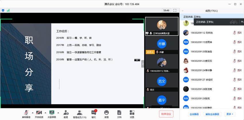 栉风沐雨六十五载,桃李芬芳谱华章。恰逢西安工业大学建校65周年华诞来临之际,2020年4月18日晚19:00,材化学院通过“腾讯会议”特别举办了“薪火相传西工魂 奋力追梦材化人”优秀校友云报告会,学院党委副书记张艳霞、副院长陈卫星、郭永春,各年级学生辅导员及180余名学生代表参加了此次云报告会。本次校友云报告会由2009级校友果志伟、2012级校友王学东、2013级校友郝运和2014级校友姚智豪主讲,2019级学生辅导员乔娜主持。