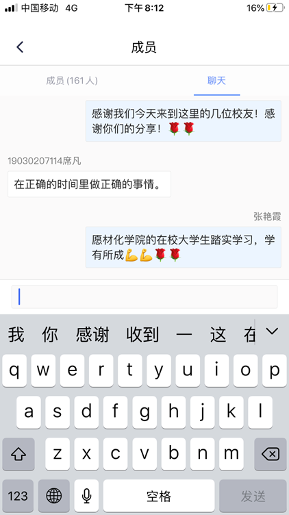 听取此次优秀校友云报告会的学生席凡谈到:非常感谢学院给我们提供的这个与优秀学长对话的机会,这将是一堂难忘的课程,感谢学长们的分享与鼓励。我非常钦佩学长们的自律和坚持,也感恩自己能在材化学院学习,我将以这四位优秀的学长为榜样,成为母院和母校的骄傲。