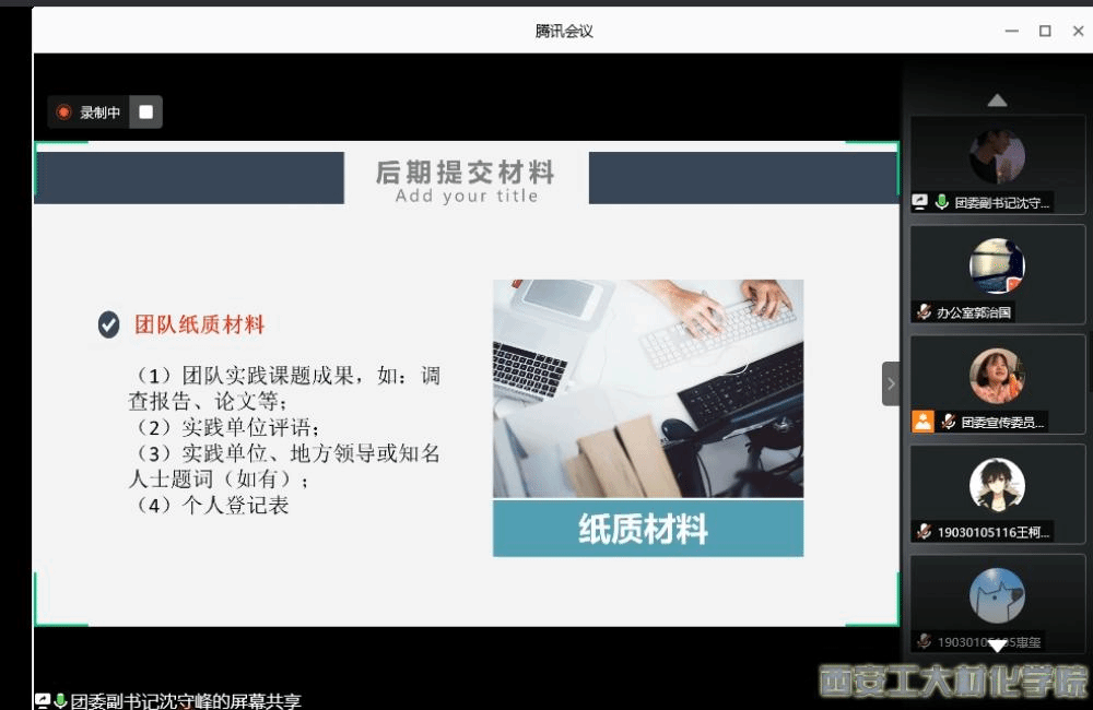 为加深同学们对此次暑期团体社会实践的了解,确保此次实践能够顺利进行,材料与化工学院团委于2020年7月15日下午19:00在线上召开了暑期团队社会实践培训大会。材料与化工学院团委书记段强老师、团委副书记乔娜老师、团委干部及所有参与暑期团体社会实践的学生参加本次会议。