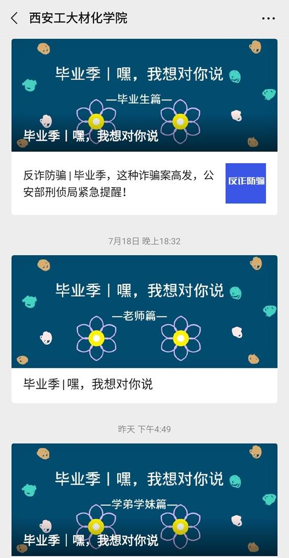 材化学院开展的“一声西工人 一生西工情”2020年毕业季主题系列活动,毕业生们通过不同形式勾起了对大学生活的点滴记忆,在感受到母校母院有爱暖心的同时,激发起爱校荣校情感,更加巩固了毕业学子和学校、学院之间联系的纽带。