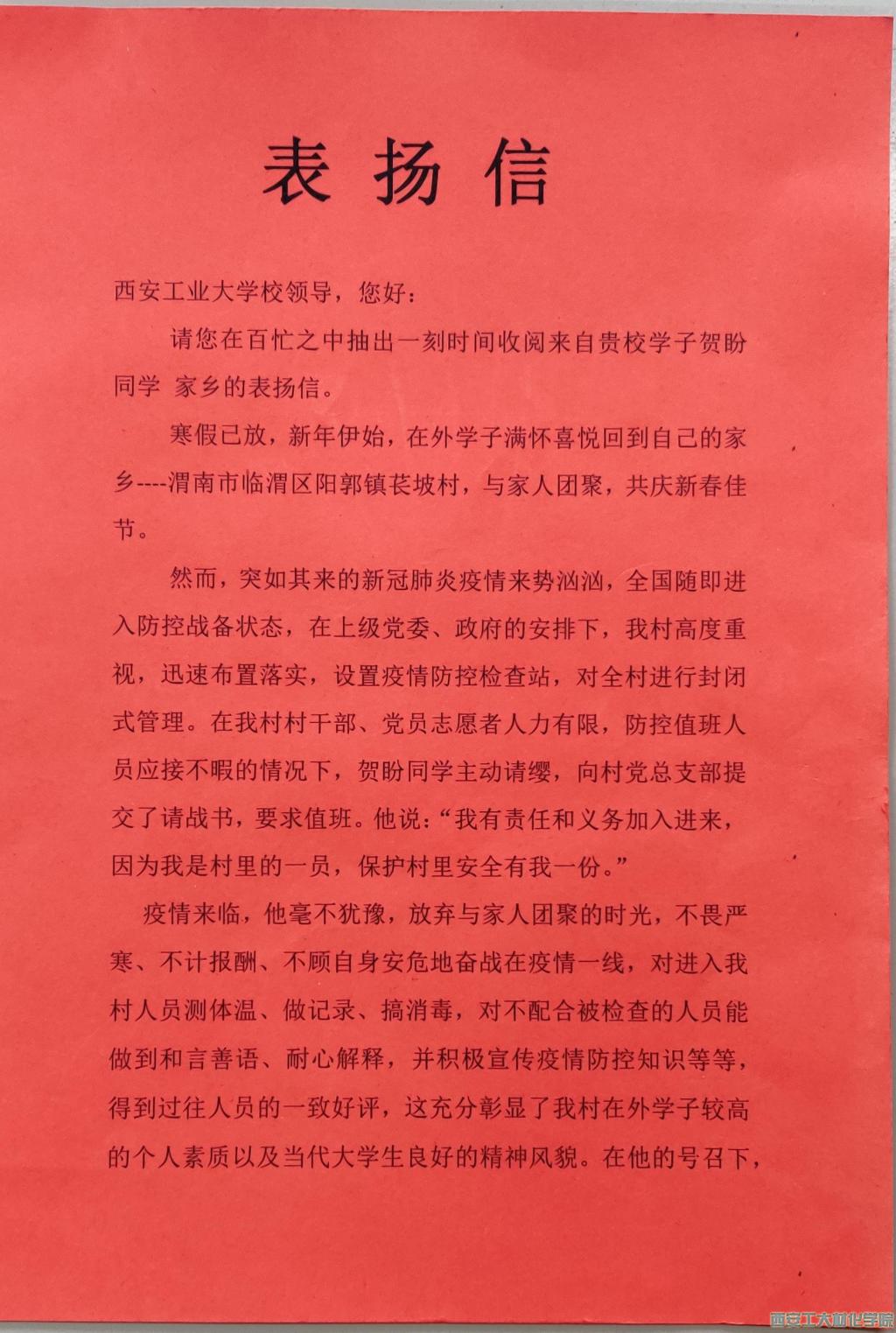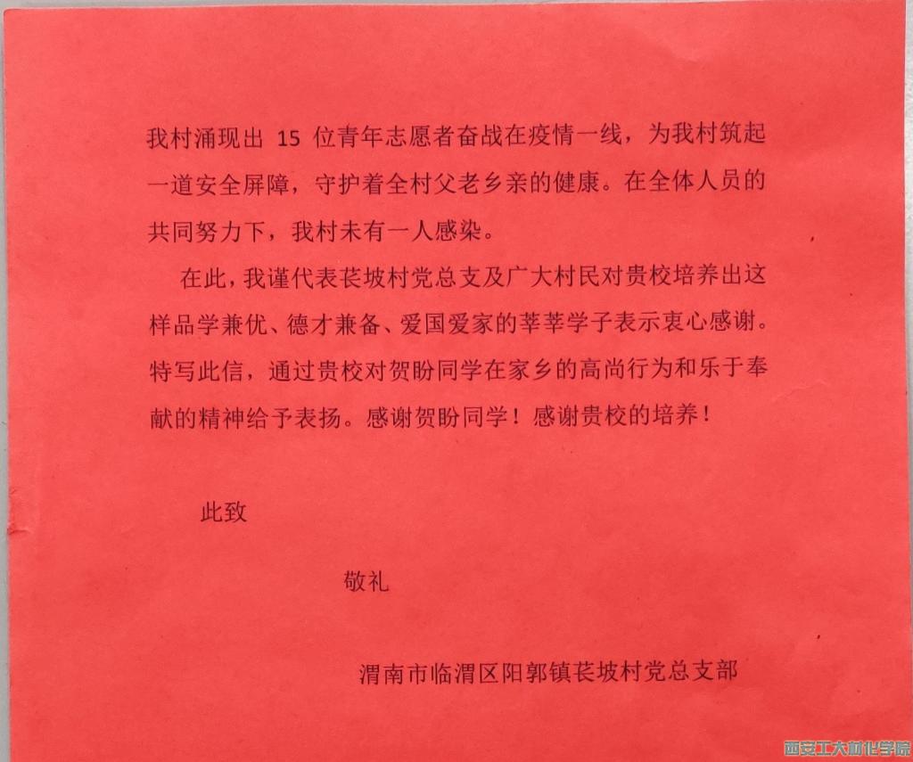 近日我院收到了来自渭南市临渭区阳郭镇医坡村的疫情表扬信,信中对材化学院2018级材料化学专业贺盼同学在疫情期间,为当地疫情防控工作贡献青春力量提出了感谢和表扬,并对西安工业大学立德树人、人才培养和育人工作给予高度的肯定。