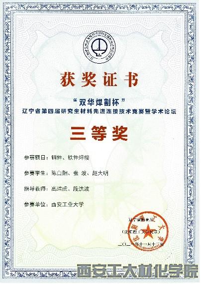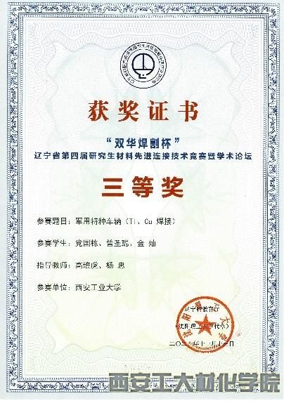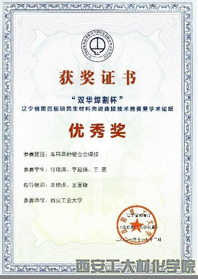 经过网络远程评审、研究生答辩、专家现场评分等环节,西安工业大学三支参赛队伍全部获奖。其中由杨忠、高培虎指导,研究生党国栋、曾圣聪、金灿共同完成的作品《军用特种车辆(Ti、Cu焊接)》,高培虎、段宏波指导,研究生陈白阳、张波、赵大明共同完成的作品《钢件、铁件焊接》荣获三等奖,高培虎、王喜锋指导,研究生付瑞涛、李起保、王震共同完成的作品《车用异种铝合金焊接》荣获优秀奖。