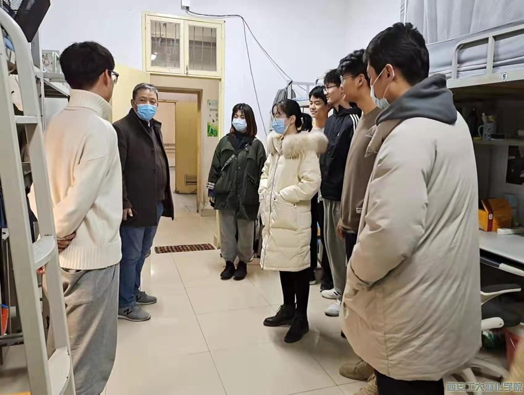 为切实落实疫情防控政策,深入了解学生宿舍生活情况,保障学生生活学习环境健康安全,提高学生疫情防控意识,2021年12月24日晚,材化学院党委副书记陈卫星与学生辅导员张瑞红、王国栋、段强、徐慧子、乔娜深入学生公寓,看望慰问我院学生。