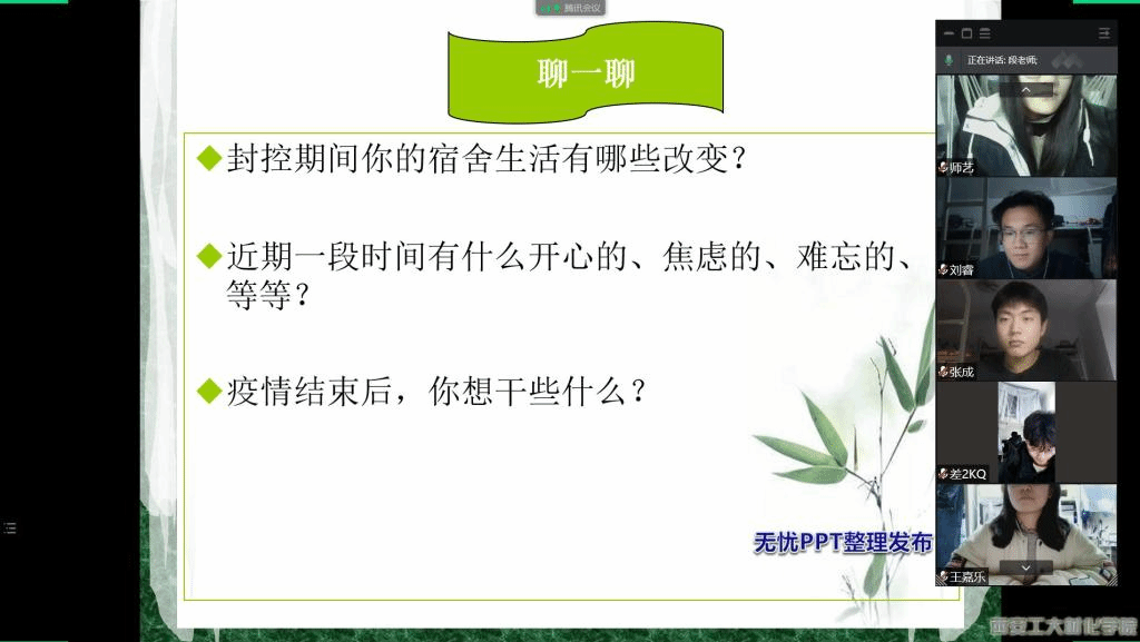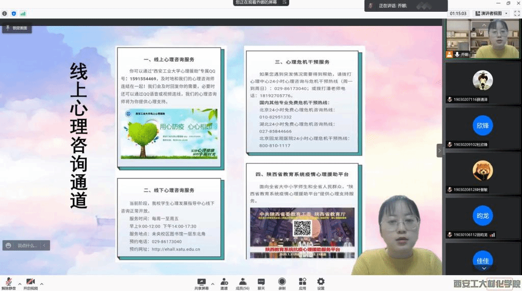 为缓解学生焦虑心理状态,学校心理中心潘治辉老师为材化学院举办“我与‘心灵有个约会’”线上心理团辅活动。各年级分别开展心理主题班会,引导学生掌握心理调适技巧和方法。