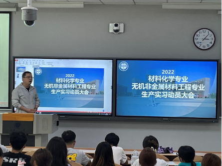 2022年5月20日下午,2019级材料化学和无机非金属材料工程专业在教2-102举办了生产实习动员大会.为统一思想,提高认识,确保生产实习工作取得预期实效,本次动员大会主要对实习内容以其重要性做了说明,无机非金属材料工程专业主任靳长清、材料化学专业主任扈琳、无机非金属材料与工程专业副主任郭菲菲和材料化学专业教师宋岩出席会议,2019级材料化学和无机非金属材料工程专业全体学生参加会议。