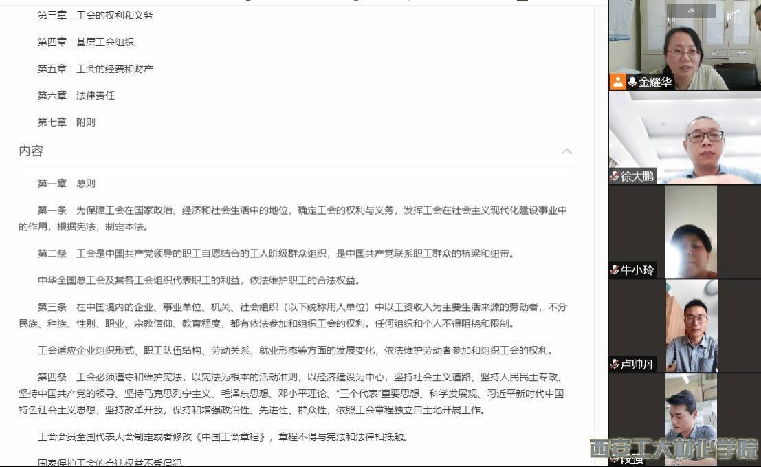 金耀华传达了校工会委员会关于《2022年工会干部上半年政治理论学习计划》的通知,领学了《中华人民共和国工会法》等重点内容。她要求各位学院分工会委员们要认真学习党的十九届六中全会和习近平总书记关于工人阶级和工会工作的重要讲话精神,切实用党的理论创新成果武装头脑,提高思想认识,进一步提高政治理论素养和服务水平,为学校改革发展提供坚强思想保证和强大精神力量。