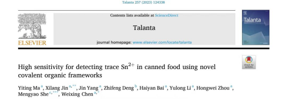 2023年2月15日,材料与化工学院2020级硕士研究生马怡婷在《Talanta》(中科院分区化学类1区,TOP期刊)上发表题为“High sensitivity for detection of trace Sn2+ in canned food using novel covalent organic frameworks”的研究论文。该期刊是化学领域国际著名期刊,也是TOP期刊。文章的第一单位是西安工业大学,第一作者为硕士研究生马怡婷,通讯作者为材料与化工学院陈卫星教授、金洗郎副教授。