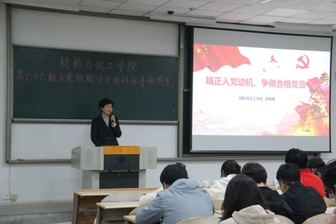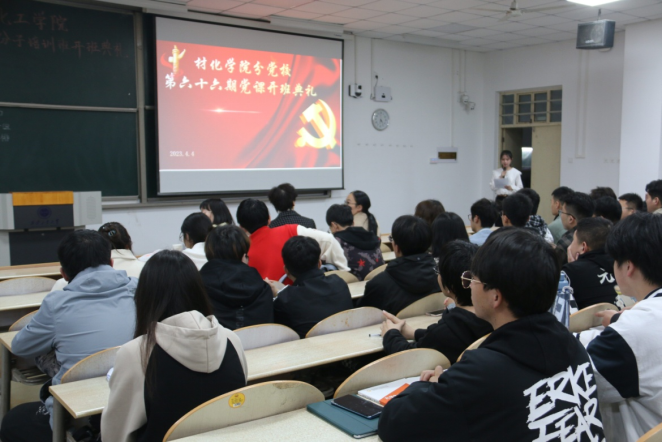 为深入学习贯彻习近平新时代中国特色社会主义思想,加强对入党积极分子的培训工作,根据校党委工作安排和党校工作要求,按照《中国共产党普通高等学校基层组织工作条例》《中国共产党党员教育管理工作条例》等文件要求,材化学院党委于2023年4月4日下午18:30在教1-103举行入第六十六期党积极分子培训班开班仪式暨第一次授课。