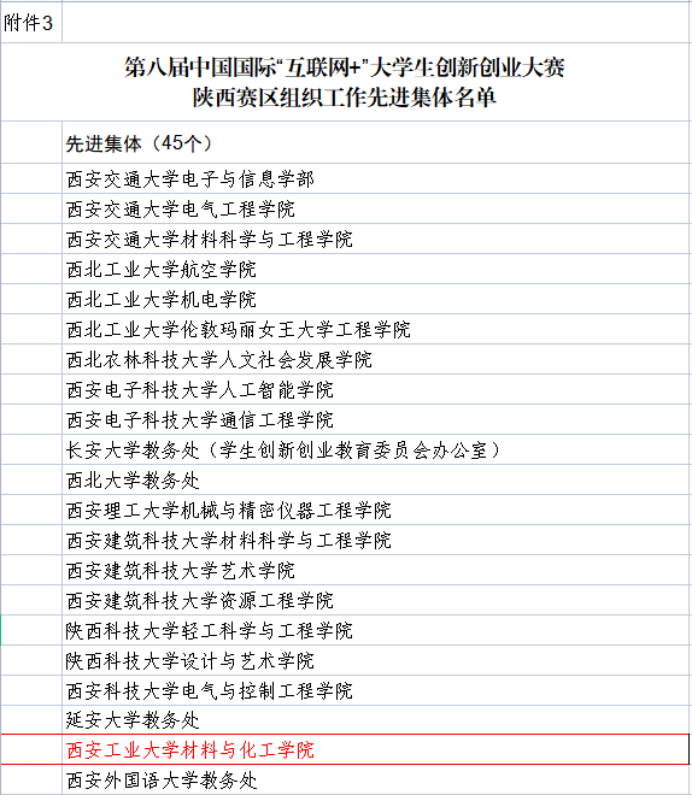 近日,陕西省教育厅《陕西省教育厅关于表彰第八届中国国际“互联网+”大学生创新创业大赛陕西赛区组织工作先进集体和先进个人的通报》(陕教函〔2023〕235号)公布,西安工业大学材料与化工学院荣获组织工作先进集体。