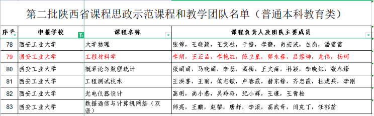 根据陕西省教育厅关于公布第二批陕西省课程思政示范课程、教学团队和教学研究示范中心认定结果的通知(陕教函〔2023〕264号)文件,我院李炳副教授及其团队申报的《工程材料学》课程项目成功获批陕西省课程思政示范课程和教学团队。