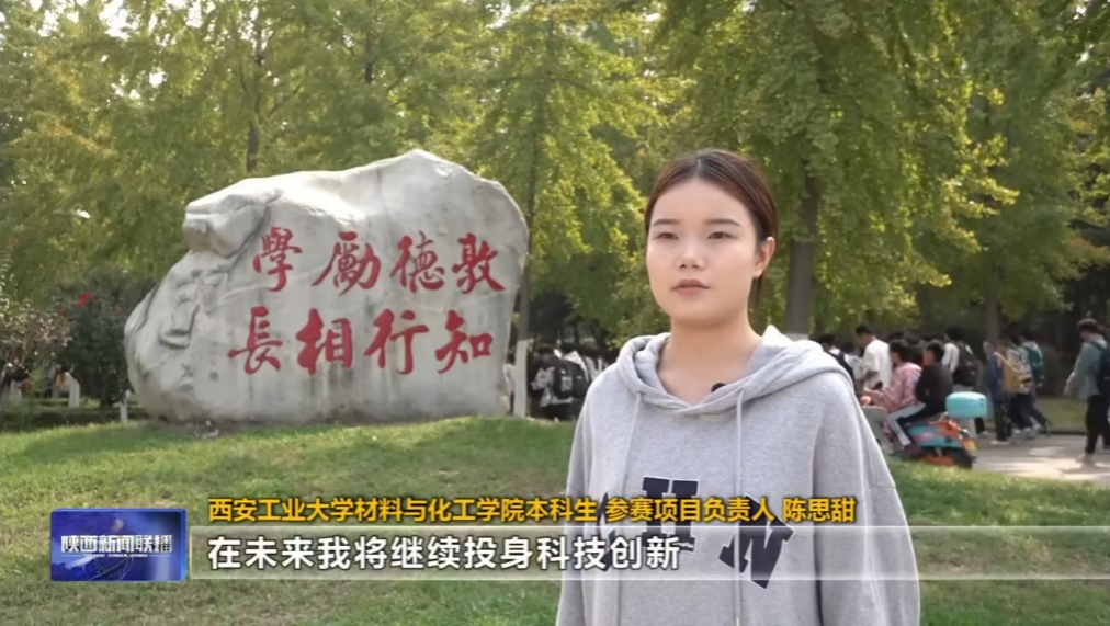 近日,《陕西新闻联播》报道我校材料与化工学院大学生创新大赛国赛参赛项目——“变害为宝,一箭三雕:镁渣赋能聚烯烃石塑2.0复合材料启明星”,团队核心成员、2022级高分子专业本科生陈思甜代表团队接受采访。