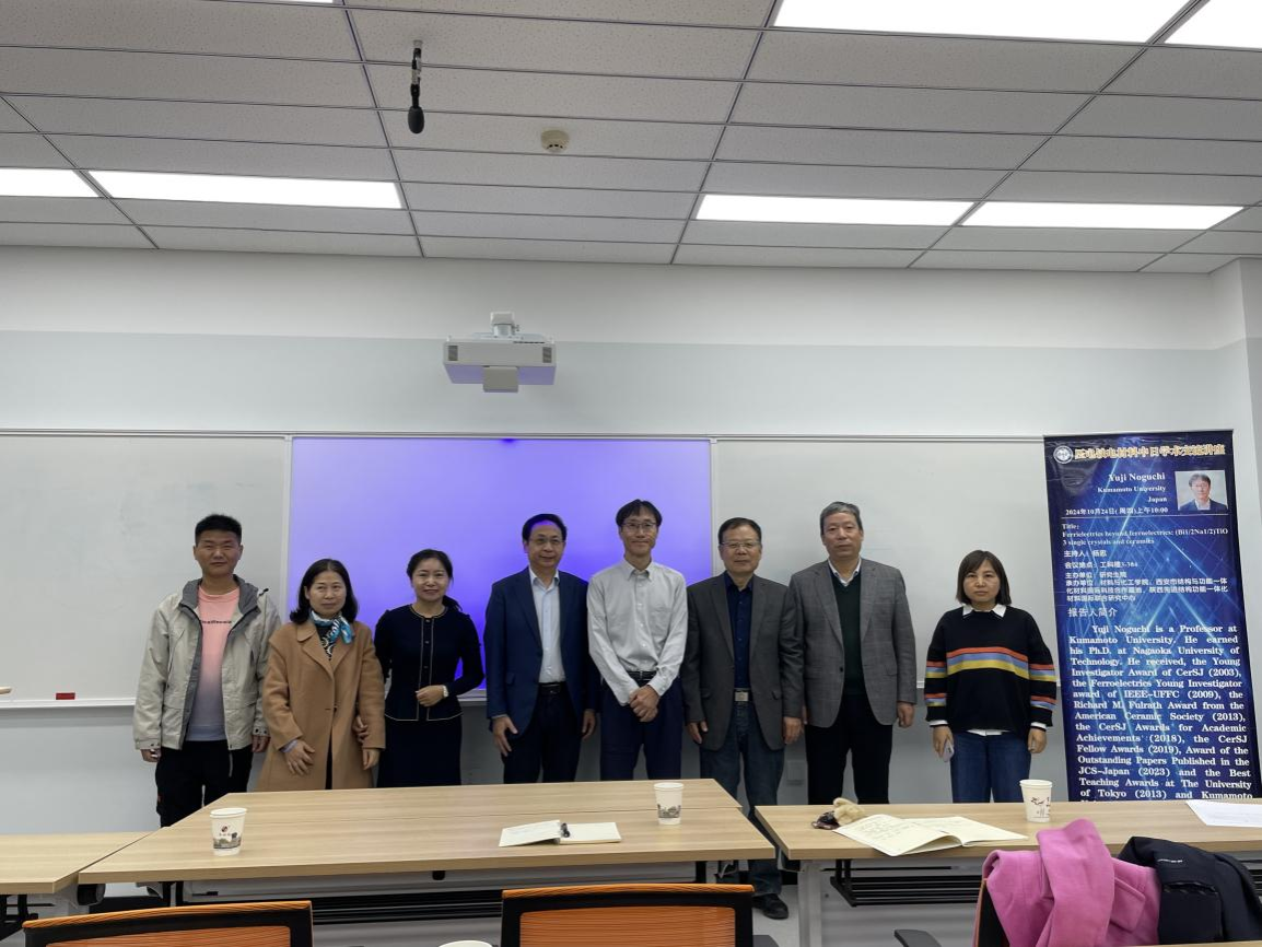 2024年10月24日早上10点在工3-304学术报告厅,材料与化工学院及西安市结构与功能一体化材料国际科技合作基地邀请日本熊本大学Yuji Noguchi教授为师生做题“Ferrielectrics beyond ferroelectrics: (Bi1/2Na1/2)TiO3 single crystals and ceramics”的学术报告。本次报告由材化学院书记陈卫星教授主持,参加本次报告的还有材化学院惠增哲教授、光电学院戴中华教授,以及材料学院教师及研究生。
