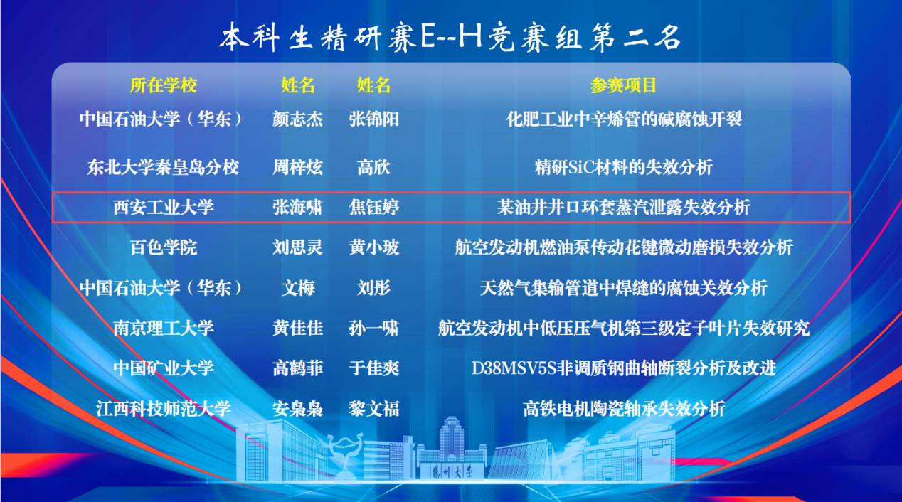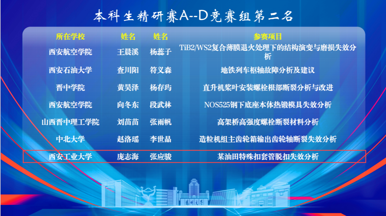 该项赛事是我国材料失效分析领域唯一的全国性赛事。通过参加本次比赛,增强了同学们对材料失效分析相关专业知识的认识与应用,提升了学生的科研学习能力及创新能力。通过综合运用材料学相关理论及工程实践经验,提高了学生分析、解决实际复杂工程问题的能力,为今后的学习和工作奠定了坚实的专业基础。