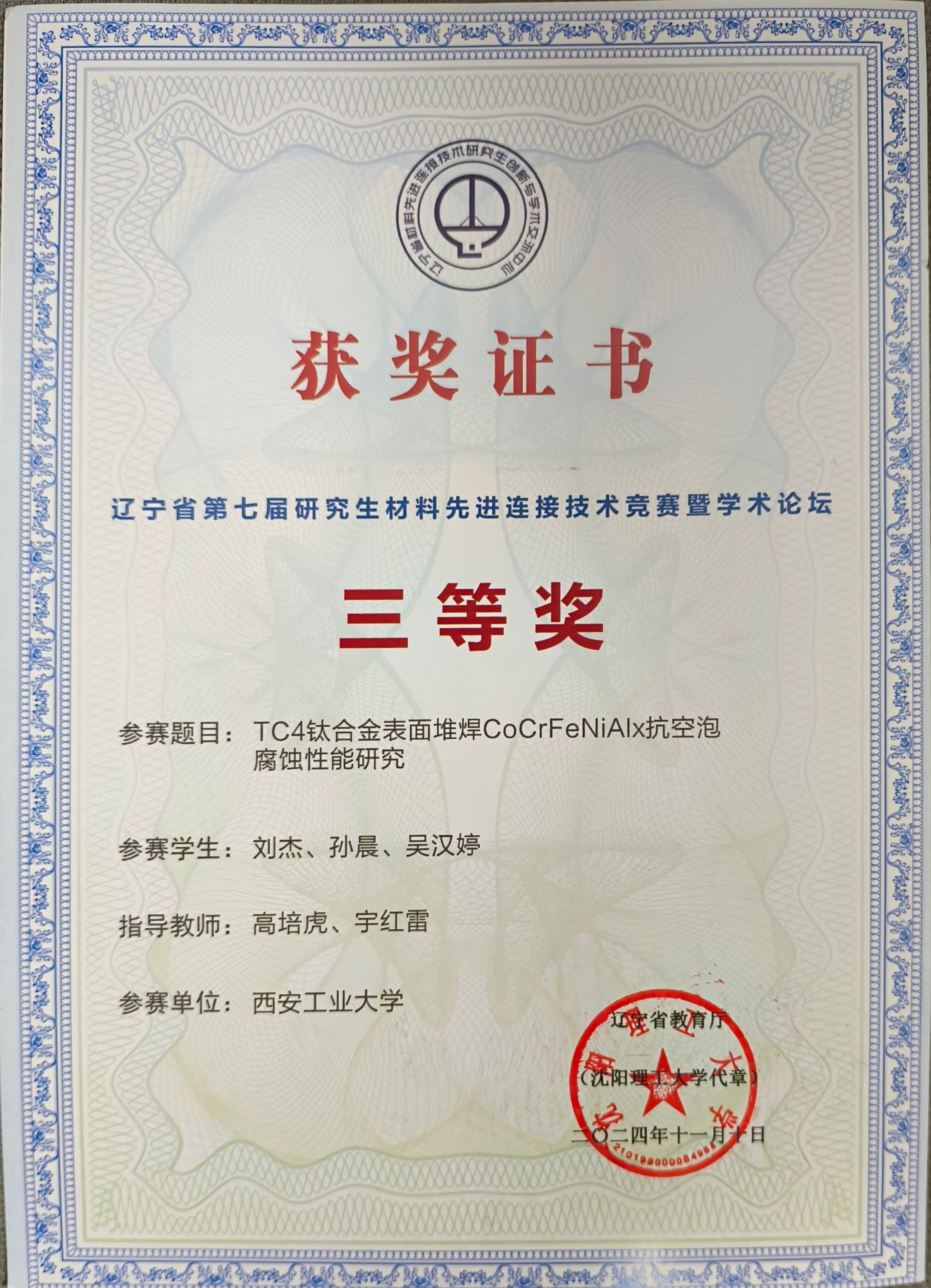 在研究生院的指导和大力支持下,材料与化工学院高度重视、积极组织参赛。经过评审、研究生答辩、专家现场评分等环节,获得一等奖1项、三等奖2项,西安工业大学获优秀组织奖。其中由高培虎、郭巧琴指导,研究生陈白阳、赵大明、张波共同完成的作品《高速激光堆焊AlxCoCrFeNi高温抗氧化性研究》荣获一等奖,高培虎、杨忠指导,研究生李景博、罗任乔、冉旭航共同完成的作品《CoCrFeNiMn堆焊层抗侵彻行为研究》荣获三等奖,高培虎、宇红雷指导,研究生刘杰、孙晨、吴汉婷共同完成的作品《TC4钛合金表面堆焊CoCrFeNiAlx抗空泡腐蚀性能研究》荣获三等奖。