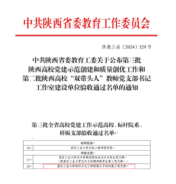 近日,省委教育工委公布了第三批陕西高校党建示范创建和质量创优工作验收结果,我院高分子材料教工党支部顺利通过验收。