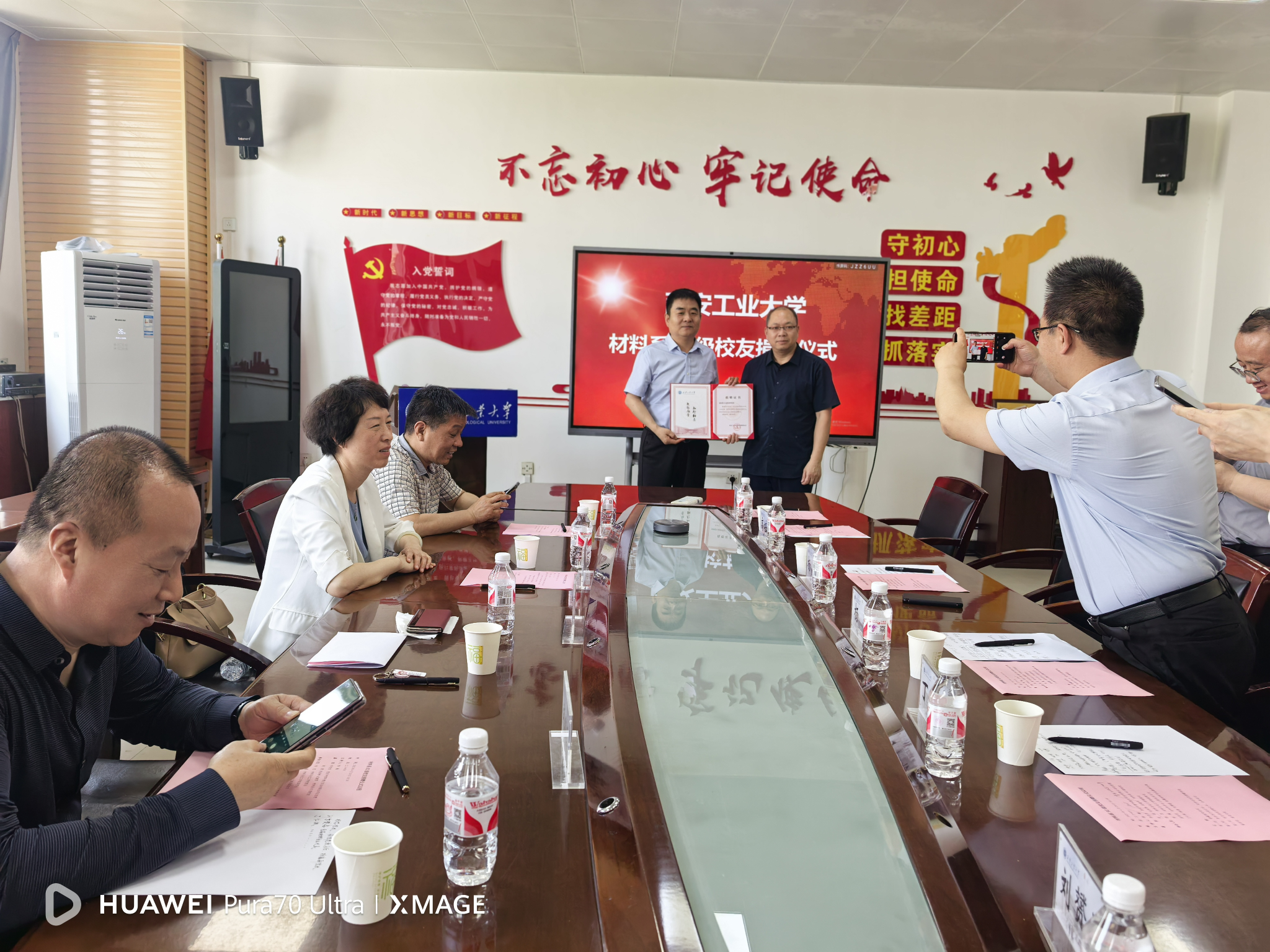 接着,杨忠院长为校友颁发捐赠证书,并与大家合影留念,记录下这一温暖而有意义的时刻。最后,与会人员进行了座谈交流,围绕学院发展、人才培养等话题畅所欲言,现场氛围热烈融洽。
