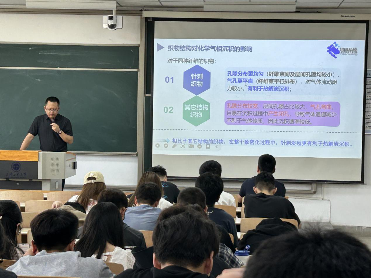 张灵玉高级工程师介绍了先进炭/炭复合材料的研发思路,以飞机刹车盘为例,重点介绍了碳纤维三维立体编织成形,制备碳陶复合摩擦材料的新产品研发、生产及航空制动器的典型应用。期间,张灵玉高级工程师与同学进行了热烈地互动交流,分享了自己从事炭/炭复合材料研发工作多年的研究经验与心得,开拓了学生的学术和工程视野,大家均表示此次学术交流受益匪浅。