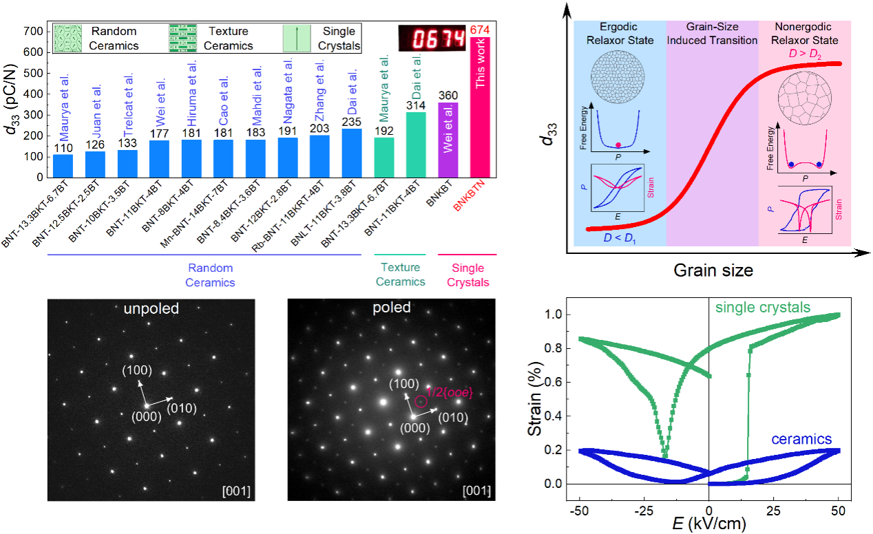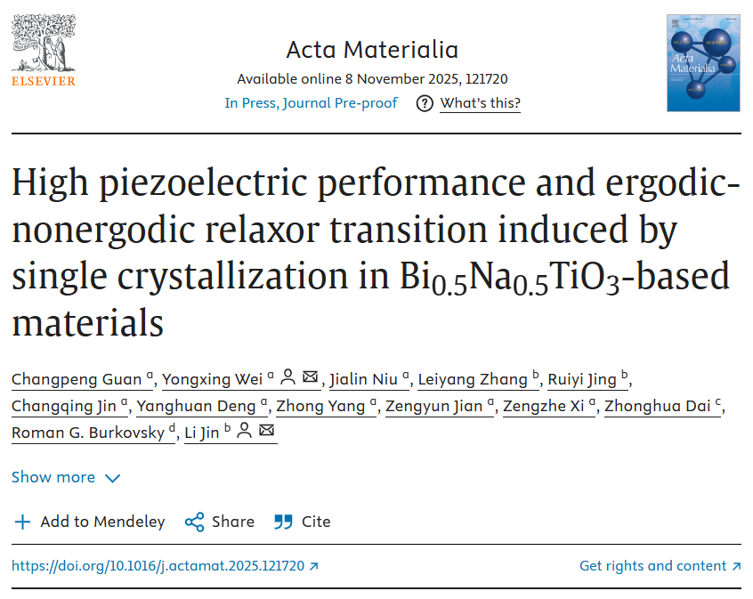 近日,我校魏永星副教授研究团队硕士研究生关畅澎在国际顶级学术期刊《Acta Materialia》(IF=9.3)上发表了题为“High piezoelectric performance and ergodic-nonergodic relaxor transition induced by single crystallization in Bi0.5Na0.5TiO3-based materials”的学术论文。西安工业大学为第一通讯单位,魏永星副教授为通讯作者,西安交通大学靳立教授为共同通讯作者。