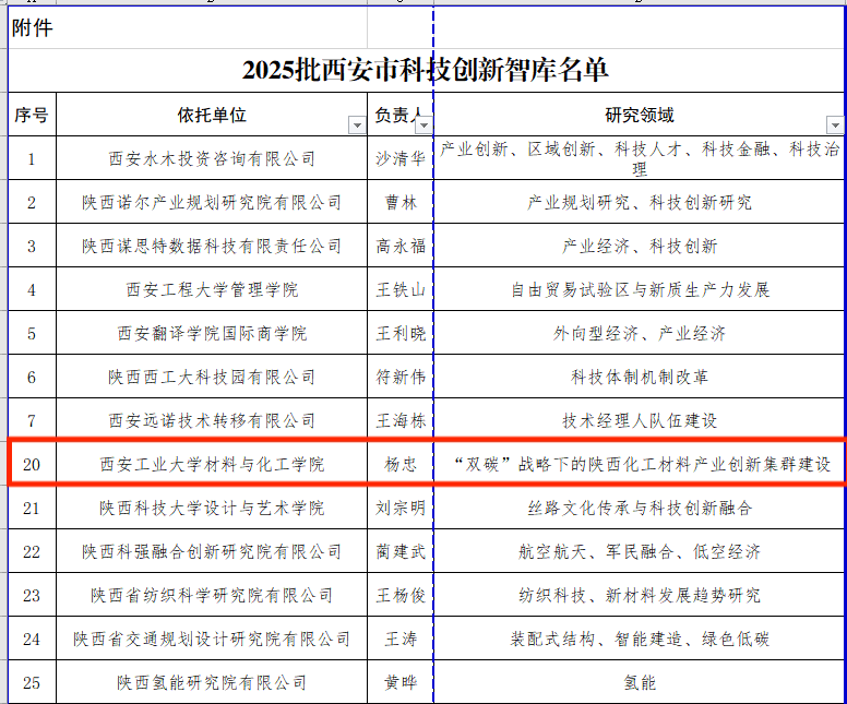 近日,西安市科学技术局正式公布“2025批西安市科技创新智库”认定名单,全市共40家高水平研究团队入选。材料与化工学院杨忠教授牵头申报的《“双碳”战略下的陕西化工材料产业创新集群建设》成功获批,标志着我院在绿色低碳与新材料交叉领域迈上新的战略高度。