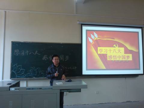 2013年4月19日,材化学院党委书记张忠为全院教现做题为《中国梦,人民梦》学习辅导报告,全面解读了中国梦的丰富内涵、实现途径和保障机制等内容,号召全院教师加强对十八大会议的有关政策、决议进行研读,深刻领悟会议精神,感悟中国梦的丰富内涵,以自己的实际行动为实现中国梦而努力;要求各支把“学习十八大,感悟中国梦”作为组织生活的主要课题,结合支部实际开展丰富多彩的特色活动。