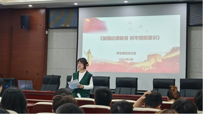 为学习贯彻习近平总书记关于党纪学习教育的重要讲话和重要指示精神,落实好学院党委开展党纪学习教育的要求,4月16日,材料与化工学院学生第四党支部在工4-204开展“加强纪律教育,树牢规矩意识”主题党日活动。活动由党支部书记徐慧子主持,支部全体成员参加本次活动。
