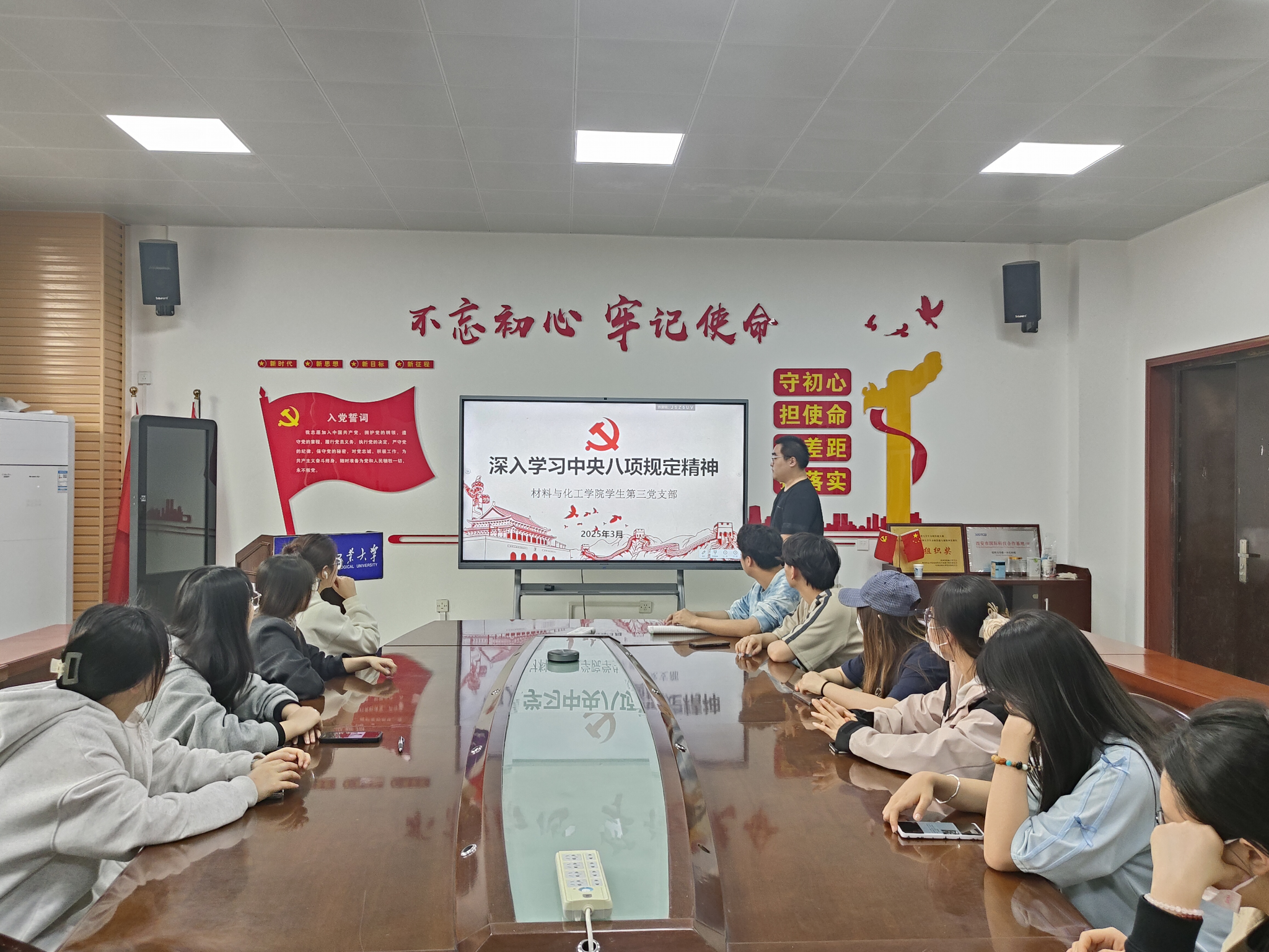 3月25日,材料与化工学院学生第三党支部于工3-410开展深入贯彻中央八项规定精神学习教育会,党委书记陈卫星、支部书记段强以及全体党员参加。会议由支部副书记秦正洋主持。