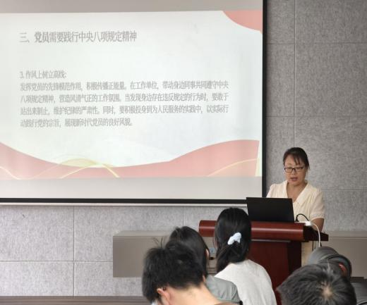 党课伊始,支部书记传达了院党委相关文件精神,从中央八项规定出台的背景、重要意义入手,解读了八项规定的具体内容。支部书记强调,中央八项规定是长期有效的铁规矩、硬杠杠,全体党员干部要提高政治站位,深刻认识到贯彻落实中央八项规定精神是捍卫“两个确立”、做到“两个维护”的具体体现,必须时刻保持清醒头脑,自觉抵制各种诱惑。在警示教育环节,通过真实案例敲响警钟,让全体党员深刻认识到廉洁自律的重要性。党员们纷纷表示,将以案为鉴、以案明纪,时刻保持清醒头脑,做到心有所畏、言有所戒、行有所止。最后,支部书记张瑞红对全体党员提出了殷切期望。她希望党员们能够将中央八项规定精神内化于心、外化于行,做到知行合一。在今后的学习和生活中,要时刻牢记党员身份,严格要求自己,自觉遵守党的纪律,始终保持清正廉洁的政治本色。
