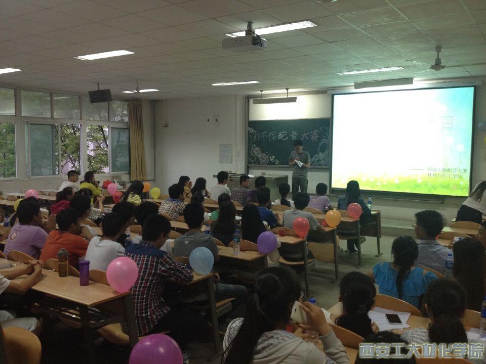 2015年4月29日19时,西安工业大学材料与化工学院举行的陕西省环保创意大赛之环保配音大赛在教二207室如期举行。参加此次活动的主要有材料与化工学院主席团,评委,十四位选手以及观众。