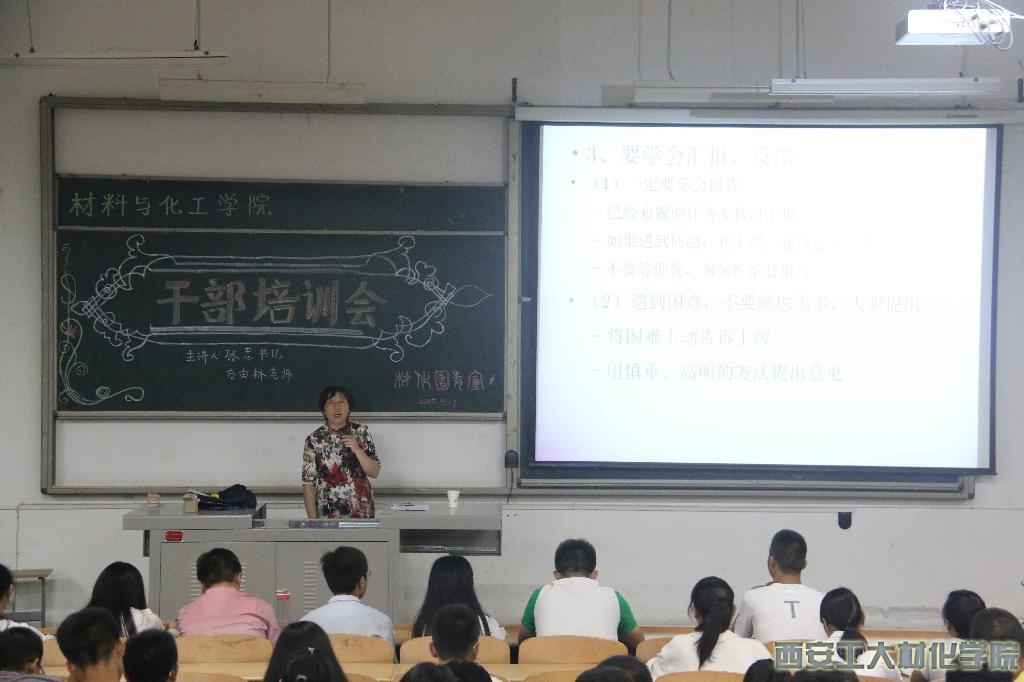 2015年9月17日晚7点,材化学院干部培训大会在教1—205隆重举行。本次大会的主讲人为材化学院党委书记张忠老师和方由林老师,出席本次大会的还有材化学院学生会、团委、科协全体成员以及2015级主要班干部。
