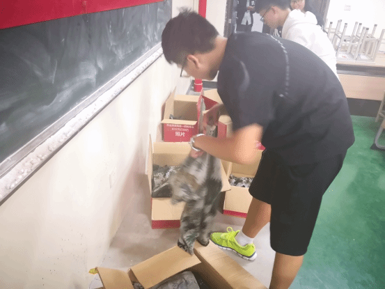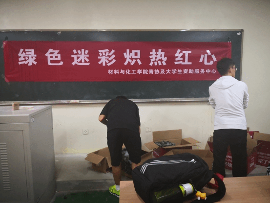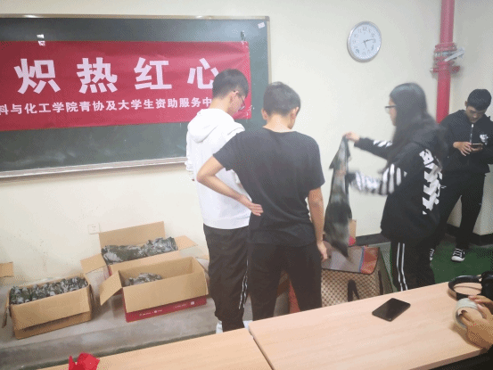 活动开始,首先是青协成员对场地进行布置,他们把标有“绿色迷彩炽热红心”的横幅挂于黑板上,并组装用于装迷彩服的箱子,忙碌的身影展现出青协成员对此次活动的重视。随后,由18级各班班长将收得的军训服捐出,表示对此次志愿活动的支持。青协全体成员收集并清点了捐赠来的军训服,共计130余套。活动现场瞬间被学生们捐赠的迷彩服占领。那些堆积起来的箱子里装的不仅仅是同学们捐赠来的衣服,还装着同学们的热情和炽热的爱。最后,青协成员和各班班长对服装的大小进行了分类、整理、装箱、等待相关人员前来运送。随着箱子被封上并被搬离现场,本次活动圆满结束。