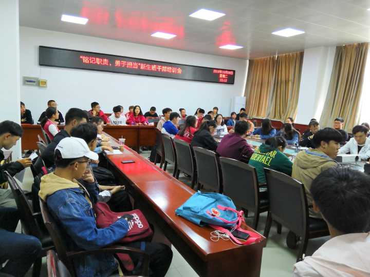 2018年10月9日中午12:10在工3-410会议室召开2018级新生班干部第二次培训会议,会议由辅导员张瑞红主持,各班班长、团支书、学习委员和舍长参加了此次培训。
