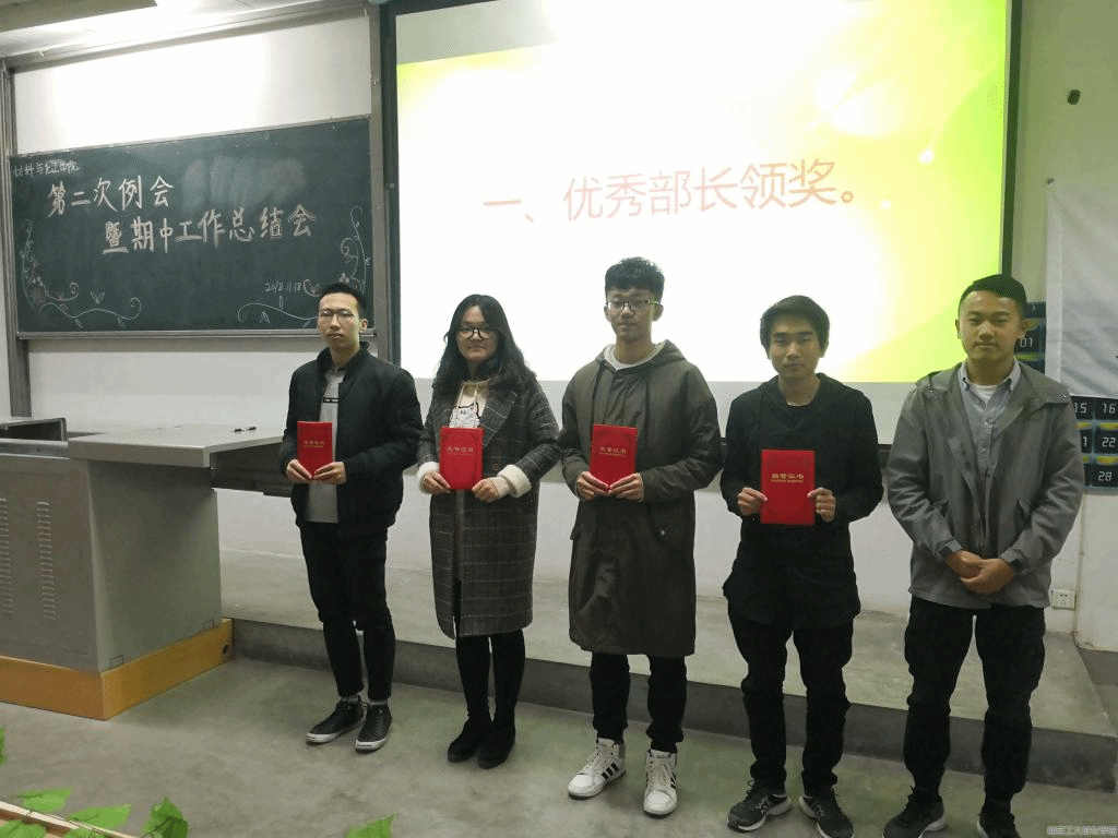 本次会议由办公室干事黄雨沫主持。首先,材料与化工学院学生会主席李靖对9月至11月的文体活动进行总结,对学生会后期工作及要求进行安排。他着重强调各部门近期工作状况,希望各部门继续保持高昂的工作热情,全力筹备接下来的活动,并宣布秘书部部长调换一事。随后,副主席陈新宣布优秀部长和部门之星名单。接着,各部门部长对各部门工作进行总结并提出希望日后学生会各部门可以顺利合作,更好完成学生会各项工作。最后进行颁奖仪式。李靖为优秀部长颁奖,副主席付贵为部门之星颁奖。至此,本次会议圆满结束。