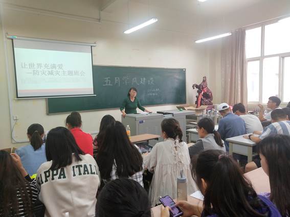 为提升抵御自然灾害防范能力,切实保障学生安全和正常教育教育教学秩序。材料与化工学院2018级辅导员张瑞红老师于2019年5月16日下午17点在工4-404开展“让世界充满爱——防灾减灾”主题活动,2018级学生参加本次活动。
