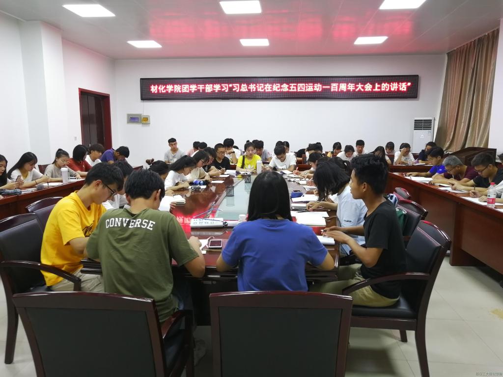 为缅怀五四先驱崇高的爱国情怀和革命精神,激励当代青年为全面建设小康社会,加快建设社会主义现代化国家的步伐、实现中华民族伟大复兴的中国梦,材料与化工学院团委组织全体团学干部于2019年6月10日晚6时在工三-410学习“习近平在纪念五四运动100周年大会上的讲话”。