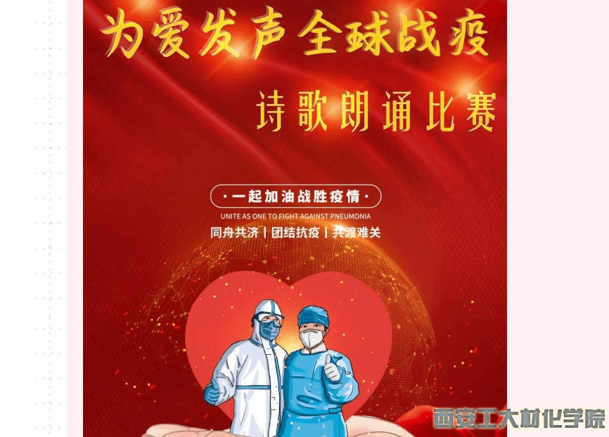 为讴歌奋战在疫情防控一线的各界抗疫英雄,共同为“坚决打赢疫情防控阻击战”贡献青春力量,材料与化工学院学生会于2020年4月22日-4月30日特举办“为爱发声,战疫全球”诗歌朗诵比赛,深化同学们的爱国之心,提升民族自豪感。