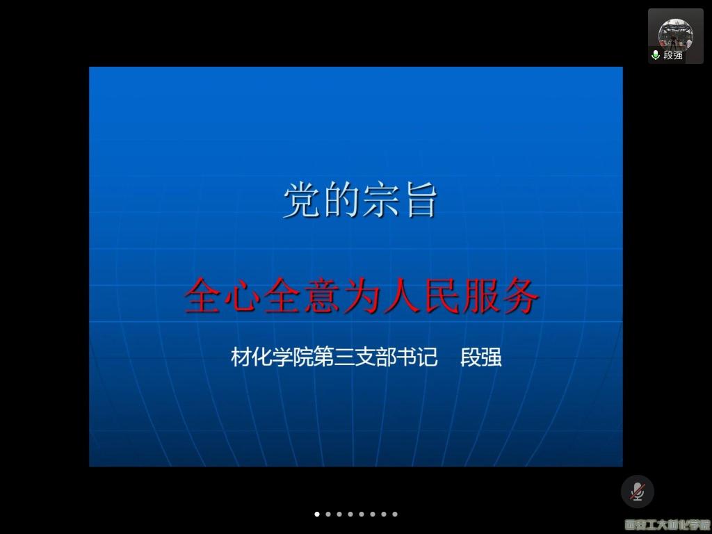 为了更好的提升学生支部党员的思想觉悟,在新形势下加深学生党员对党的宗旨更进一步的深刻认识,充分发挥先锋模范作用。2020年6月24日,材料与化工学院学生第三党支部书记段强老师为支部党员开展“全心全意为人民服务”的党课教育活动。支部全体党员23人全部参加。
