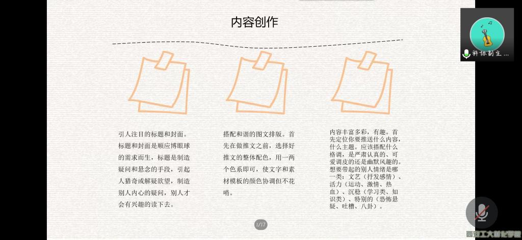 本次会议分两个议程。首先,由学生干部高梓童对活动拍照技巧进行培训,她以一段朗朗上口的拍照口诀切入,以照片示例结合拍照口诀讲述的形式,对拍照内容的人物、主题、清晰度和画面位置四部分内容进行概述。此外,她还强调照片应该直接突出会议或者活动的主题,注重人物关系等方面。随后,由学生干部邓宁波进行微信平台运行的讲解,他分别从材料与化工学院微信公众号平台的建立、登录和平台内容创作三大部分进行概述,并着重强调了订阅号和服务号的区别,详细讲述公众号的管理流程及推文的创作。详细的讲解让团学干部更好更快地了解和运用微信公众号。