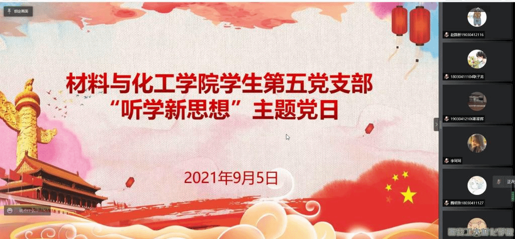 为组织学习宣传习近平新时代中国特色社会主义思想,从而教育引导广大青年学生增强“四个意识”,坚定“四个自信”,努力成为担当民族复兴大任的时代新人,材料与化工学院学生第五党支部于2021年9月5日举行“听学新思想”云党课暨主题党日活动线上学习会议,全体学生党员按时参会。