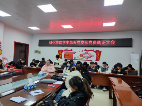 2021年10月29日,材料与化工学院学生第五党支部于工三-410召开预备党员转正会议。党支部书记乔娜、支部正式党员、预备党员等35名同志出席会议,本次会议由支部副书记吕雪敏同志主持。
