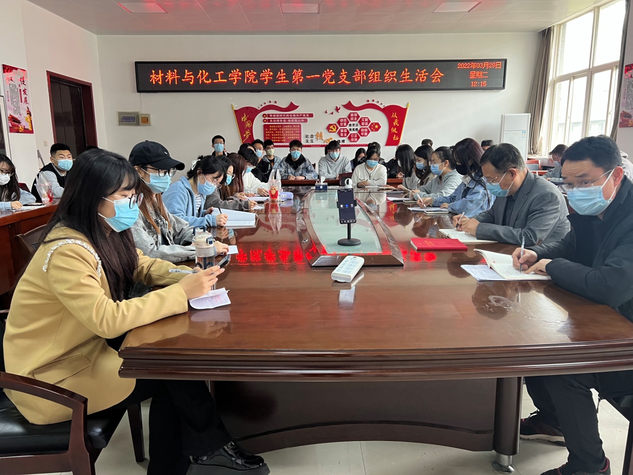 2022年3月29日13时,材料与化工学院学生第一党支部在工3-410召开2021年组织生活会,院长惠增哲、党委委员侯永刚及支部全体党员参加了会议,会议由党支部书记田剑锋主持。