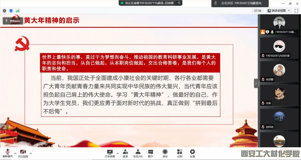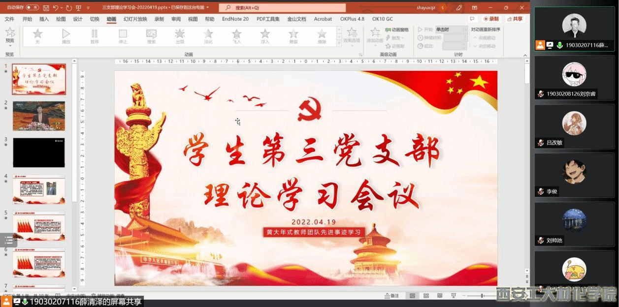 2022年4月19日下午,材料与化工学院学生第三党支部在腾讯会议召开学习黄大年式教师团队先进事迹大会。支部书记段强老师以及支部全体党员参加此次会议。