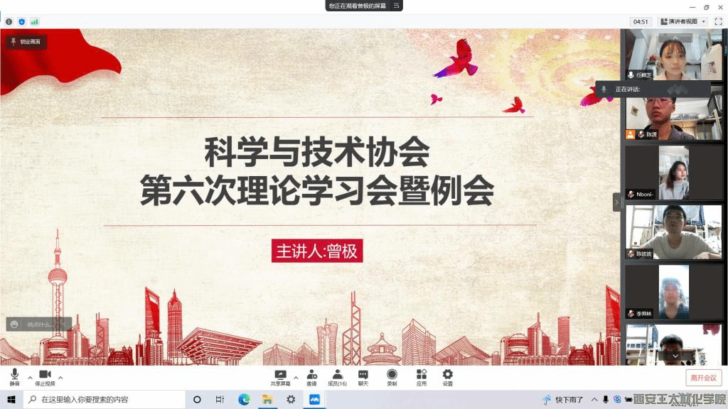 为了能更加清晰的认识到青年应肩负的重任,树立坚定的理想信念,材料与化工学院科学技术协会于2022年4月27日晚九时在腾讯会议召开了“华夏之光,时代之魂”主题教育理论学习会。本次会议由学生干部曾极主持召开,科协全体成员参加本次会议。